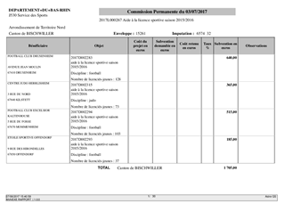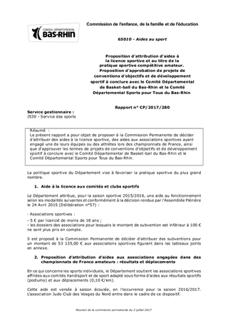 Le présent rapport a pour objet de proposer à la Commission Permanente de décider d'attribuer des aides à la licence sportive, des aides aux associations sportives ayant engagé une de leurs équipes ou des athlètes lors des championnats de France, ainsi que d'approuver les termes de projets de conventions d’objectifs et de développement sportif à conclure avec le Comité Départemental de Basket-ball du Bas-Rhin et le Comité Départemental Sports pour Tous du Bas-Rhin.