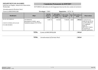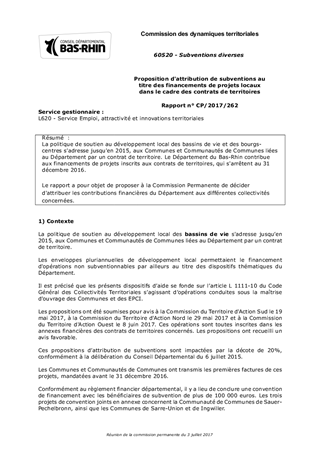 La politique de soutien au développement local des bassins de vie et des bourgs-centres s'adresse jusqu'en 2015, aux Communes et Communautés de Communes liées au Département par un contrat de territoire. Le Département du Bas-Rhin contribue aux financements de projets inscrits aux contrats de territoires, qui s'arrêtent au 31 décembre 2016. Le rapport a pour objet de proposer à la Commission Permanente de décider d'attribuer les contributions financières du Département aux différentes collectivités concernées.