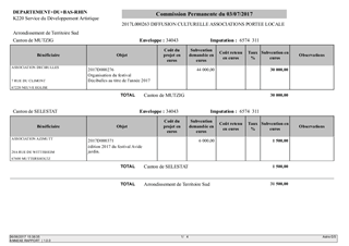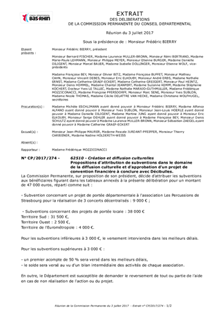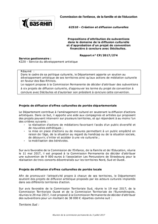 Dans le cadre de sa politique culturelle, le Département apporte un soutien au développement artistique de ses territoires ainsi qu’aux actions de médiation culturelle en faveur des Bas-Rhinois. Le rapport propose à la Commission Permanente de décider d'attribuer des subventions à six projets de diffusion culturelle, d'approuver les terme du projet de convention à conclure avec Décibulles et d'autoriser son président à conclure cette convention.