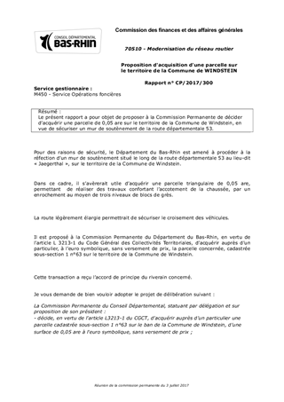 Le présent rapport a pour objet de proposer à la Commission Permanente de décider d’acquérir une parcelle de 0,05 are sur le territoire de la Commune de Windstein, en vue de sécuriser un mur de soutènement de la route départementale 53.
