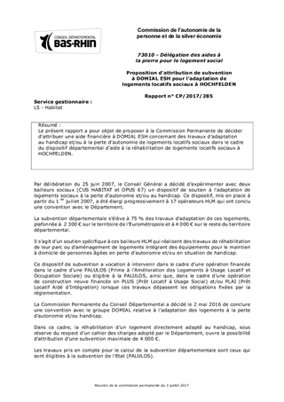 Le présent rapport a pour objet de proposer à la Commission Permanente de décider d'attribuer une aide financière à DOMIAL ESH concernant des travaux d’adaptation au handicap et/ou à la perte d’autonomie de logements locatifs sociaux dans le cadre du dispositif départemental d’aide à la réhabilitation de logements locatifs sociaux à HOCHFELDEN.