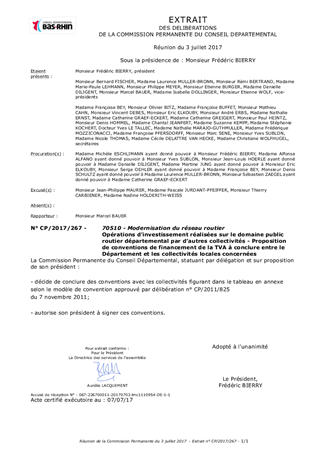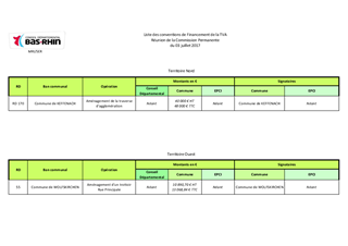 Le Département peut autoriser d’autres collectivités à effectuer des travaux sur son domaine public routier. Ces collectivités, Communes ou Communautés de communes en général, peuvent bénéficier des attributions du fonds de compensation pour la taxe sur la valeur ajoutée (FCTVA) pour les investissements réalisés sur le domaine public d’une autre collectivité à condition de conclure une convention telle que prévue par le Code général des collectivités territoriales. Les projets de conventions à conclure à ce titre ont été établis à partir d’un modèle-type approuvé par délibération de la Commission Permanente du 7 novembre 2011 (n° CP/2011/825). Il est proposé à la Commission Permanente de décider de conclure les projets de conventions de financement avec les Communes de Keffenach et de Wolfskirchen, selon les tableaux figurant en annexe.