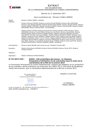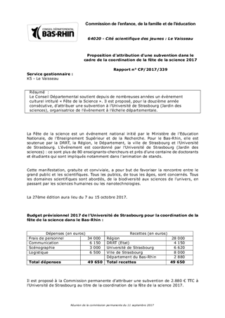 Le Conseil Départemental soutient depuis de nombreuses années un évènement culturel intitulé « Fête de la Science ». Il est proposé, pour la douzième année consécutive, d’attribuer une subvention à l’Université de Strasbourg (Jardin des sciences), organisatrice de l’évènement à l’échelle départementale.