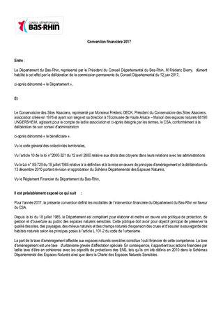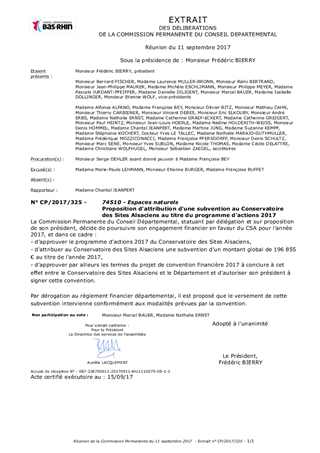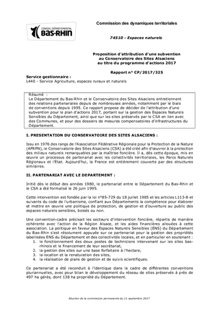 Le Département du Bas-Rhin et le Conservatoire des Sites Alsaciens entretiennent des relations partenariales depuis de nombreuses années, notamment par le biais de conventions depuis 1995. Ce rapport propose de décider de l'attribution d'une subvention pour le plan d'actions 2017, portant sur la gestion des Espaces Naturels Sensibles du Département, ainsi que sur les sites préservés par le CSA en lien avec des Communes, et pour des dossiers de mesures compensatoires d'infrastructures du Département.