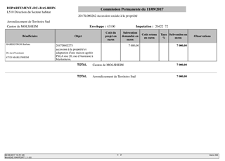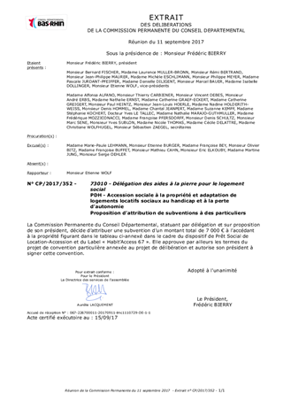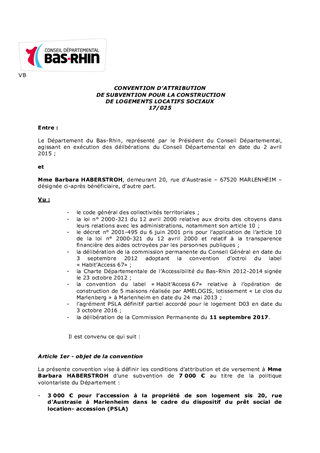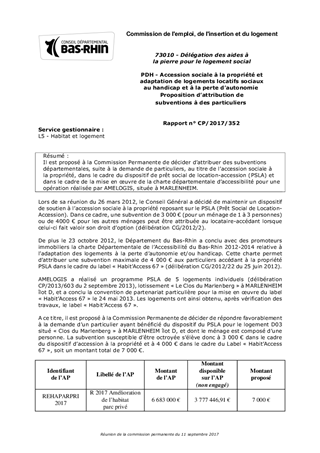 Il est proposé à la Commission Permanente de décider d’attribuer des subventions départementales, suite à la demande de particuliers, au titre de l’accession sociale à la propriété, dans le cadre du dispositif de prêt social de location-accession (PSLA) et dans le cadre de la mise en œuvre de la charte départementale d’accessibilité pour une opération réalisée par AMELOGIS, située à MARLENHEIM.