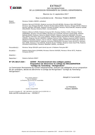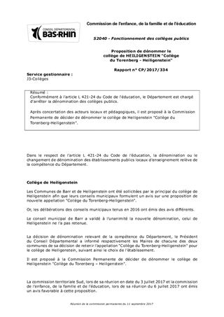Conformément à l'article L 421-24 du Code de l'éducation, le Département est chargé d'arrêter la dénomination des collèges publics. Après concertation des acteurs locaux et pédagogiques, il est proposé à la Commission Permanente de décider de dénommer le collège de Heiligenstein "Collège du Torenberg-Heiligenstein".