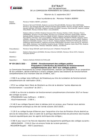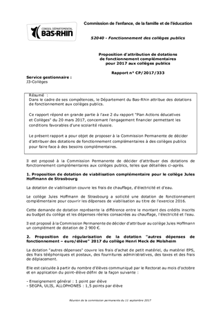 Dans le cadre de ses compétences, le Département du Bas-Rhin attribue des dotations de fonctionnement aux collèges publics. Ce rapport répond en grande partie à l'axe 2 du rapport "Plan Actions éducatives et Collèges" du 20 mars 2017, concernant l'engagement financier permettant les conditions favorables d'une scolarité réussie. Le présent rapport a pour objet de proposer à la Commission Permanente de décider d'attribuer des dotations de fonctionnement complémentaires à des collèges publics pour faire face à des besoins complémentaires.