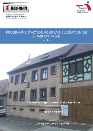 Le présent rapport a pour objet de présenter à la Commission Permanente l'avenant n°1 au programme d'action pour l'amélioration de l'habitat privé 2017 sur le territoire départemental en-dehors de celui de l'Eurométropole de Strasbourg. Ce programme constitue le support opérationnel pour l'attribution des aides de l'Agence Nationale de l'Habitat (ANAH) pour le compte de laquelle le Département est délégataire des aides à la pierre. Son approbation relève de la compétence du président du Conseil Départemental. L'avenant a pour objet de prévoir la mise en œuvre du dispositif "Louer abordable" développé par l'ANAH et de réviser en conséquence le dispositif de conventionnement pour les propriétaires bailleurs.