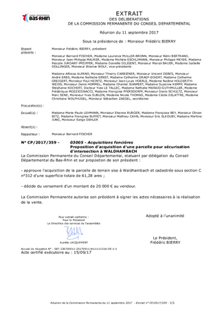Le rapport a pour objet de proposer à la Commission Permanente de décider de l'acquisition d'une parcelle de terrain à Waldhambach le long de la RD919 au droit du carrefour avec la RD239.