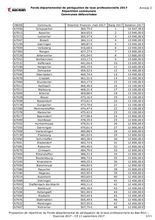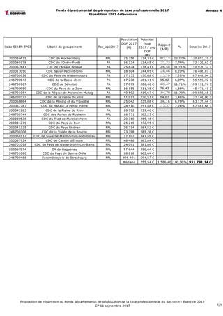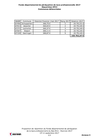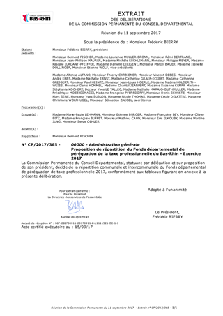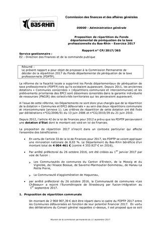 Proposition de répartition du Fonds départemental de péréquation de la taxe professionnelle du Bas-Rhin - Exercice 2017