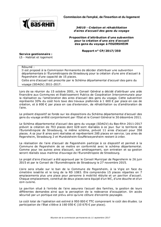 Il est proposé à la Commission Permanente de décider d’attribuer une subvention départementale à l’Eurométropole de Strasbourg pour la création d'une aire d’accueil à Fegersheim d’une capacité de 15 places. Cette aire d'accueil est prescrite par le Schéma départemental d'accueil des gens du voyage (SDAGV) 2011-2017.