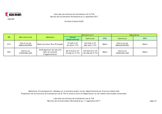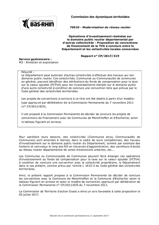 Le Département peut autoriser d’autres collectivités à effectuer des travaux sur son domaine public routier. Ces collectivités, Communes ou Communautés de communes en général, peuvent bénéficier des attributions du fonds de compensation pour la taxe sur la valeur ajoutée (FCTVA) pour les investissements réalisés sur le domaine public d’une autre collectivité à condition de conclure une convention telle que prévue par le Code général des collectivités territoriales. Les projets de conventions à conclure à ce titre ont été établis à partir d’un modèle-type approuvé par délibération de la Commission Permanente du 7 novembre 2011 (n° CP/2011/825). Il est proposé à la Commission Permanente de décider de conclure les projets de conventions de financement avec les Communes de Menchhoffen et d’Eschwiller, selon le tableau figurant en annexe.