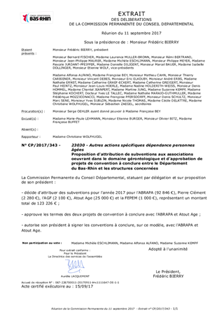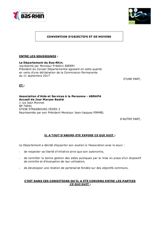 Le présent rapport a pour objet de proposer à la Commission Permanente de décider d'attribuer des subventions de fonctionnement à des associations et structures oeuvrant dans le domaine gérontologique, ainsi que d’approuver les termes du projet de convention d'objectifs et de moyens à conclure entre le Département du Bas-Rhin, l’ABRAPA et l’association ATOUT AGE et d’autoriser son président à les signer.
