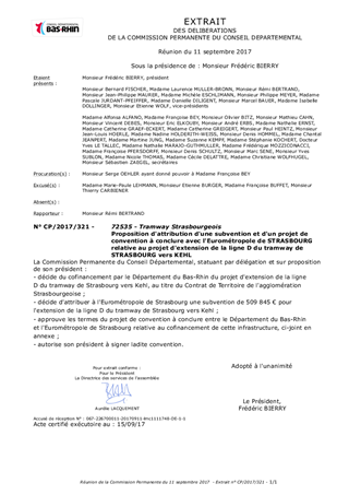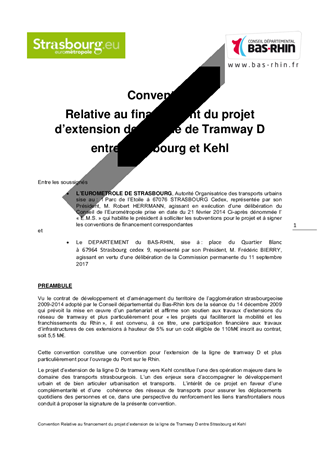 Le présent rapport a pour objet de proposer à la Commission Permanente de décider du cofinancement par le Département du Bas-Rhin du projet d'extension de la ligne D du tramway de Strasbourg vers Kehl et d'approuver les termes du projet de convention à conclure avec l'Eurométropole de Strasbourg.