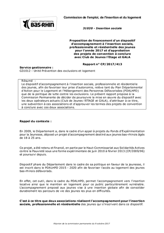 Proposition de financement d'un dispositif d'accompagnement à l'insertion sociale, professionnelle et résidentielle des jeunes pour l'année 2017 et d'approbation des projets de convention à conclure avec Club de Jeunes l'Etage et GALA