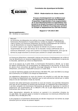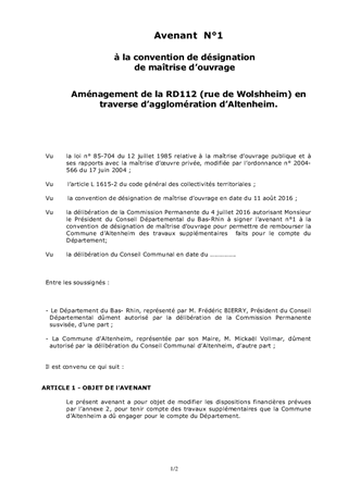 La convention de désignation de maîtrise d’ouvrage n°2016/084, adoptée par la Commission Permanente le 4 juillet 2016 sur la base du rapport n° CP/2016/302, visait à confier à la Commune d’Altenheim les travaux d’aménagement de la RD112 (rue de Wolschheim) en traverse d’agglomération d’Altenheim. Le présent rapport a pour objet de proposer de décider de prendre en compte l’augmentation de la part des travaux de la chaussée, travaux préfinancés par la Commune d’Altenheim, et qui sont à porter à la charge du Département, ainsi que les termes du projet d'avenant à conclure pour prendre en compte cette décision.