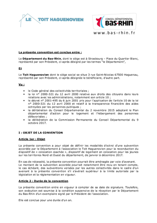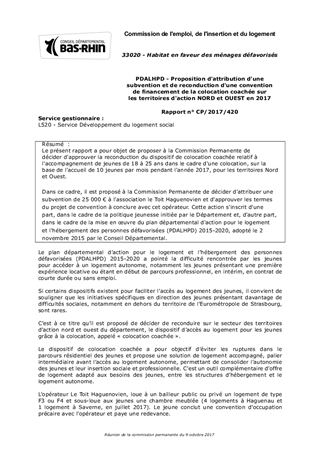 Le présent rapport a pour objet de proposer à la Commission Permanente de décider d'approuver la reconduction du dispositif de colocation coachée relatif à l'accompagnement de jeunes de 18 à 25 ans dans le cadre d'une colocation, sur la base de l'accueil de 10 jeunes par mois pendant l'année 2017, pour les territoires Nord et Ouest. Dans ce cadre, il est proposé à la Commission Permanente de décider d'attribuer une subvention de 25 000 € à l'association le Toit Haguenovien et d'approuver les termes du projet de convention à conclure avec cet opérateur. Cette action s'inscrit d'une part, dans le cadre de la politique jeunesse initiée par le Département et, d'autre part, dans le cadre de la mise en œuvre du plan départemental d'action pour le logement et l'hébergement des personnes défavorisées (PDALHPD) 2015-2020, adopté le 2 novembre 2015 par le Conseil Départemental.