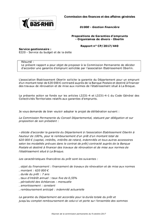 Le présent rapport a pour objet de proposer à la Commission Permanente de décider d’accorder une garantie d’emprunt sollicitée par l’association Etablissement Oberlin.
