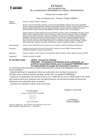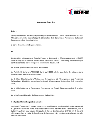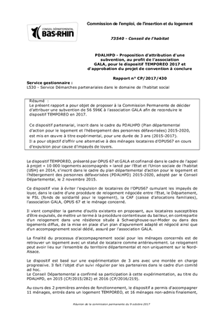 Le présent rapport a pour objet de proposer à la Commission Permanente de décider d'attribuer une subvention de 56 596€ à l'association GALA afin de reconduire le dispositif TEMPOREO en 2017. Ce dispositif partenarial, inscrit dans le cadre du PDALHPD (Plan départemental d'action pour le logement et l'hébergement des personnes défavorisées) 2015-2020, est mis en œuvre à titre expérimental, pour une durée de 3 ans (2015-2017). Il a pour objectif d'offrir une alternative à des ménages locataires d'OPUS67 en cours d'expulsion pour cause d'impayés de loyers.