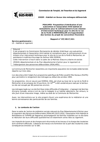 Il est proposé à la Commission Permanente de décider d’attribuer une subvention départementale à l’association AVA habitat et nomadisme pour le cofinancement d’une mission d’un intervenant technique pour le site de la rue de la Forêt à Mertzwiller, en assistance à maîtrise d’ouvrage du bailleur HSA DOMIAL. Cette intervention s'inscrit dans le cadre de la Maitrise d'œuvre urbaine et sociale (MOUS) départementale et du Plan départemental d'action pour le logement et l'hébergement des personnes défavorisées (PDALHPD).
