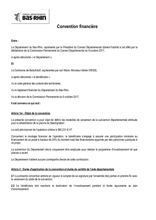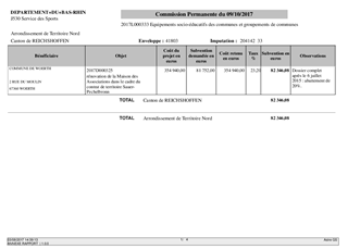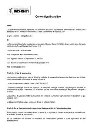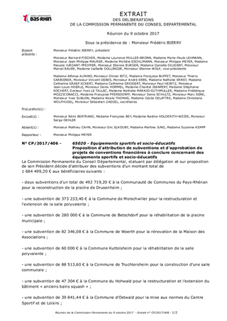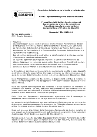 Le présent rapport a pour objet de proposer à la Commission Permanente de décider d'attribuer des subventions, inscrites dans les contrats de territoire, aux Communes de Morschwiller, de Betschdorf, d'Ostwald, de Holtzheim, de Woerth, du Hohwald, de Kuttolsheim, de Truchtersheim, à la Communauté de Communes du Pays-Rhenan et à l'Eurométropole de Strasbourg. Ces subventions concernent la construction, la transformation et la mise aux normes d’équipements sportifs et socio-éducatifs. Ce rapport a également pour objet de proposer à la Commission Permanente de décider d'approuver les termes de quatre projets de conventions financières à conclure avec les Communes de Morschwiller et de Betschdorf, avec la Communauté de Communes du Pays-Rhénan et avec l'Eurométropole de Strasbourg.