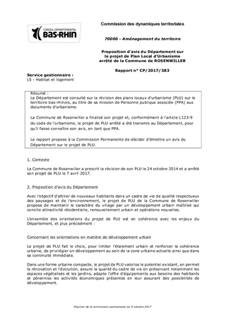 Le Département est consulté sur la révision des plans locaux d’urbanisme (PLU) sur le territoire bas-rhinois, au titre de sa mission de Personne publique associée (PPA) aux documents d’urbanisme. La Commune de Rosenwiller a finalisé son projet et, conformément à l'article L123-9 du code de l’urbanisme, le projet de PLU arrêté a été transmis au Département, pour qu’il fasse connaître son avis, en tant que PPA. Le rapport propose à la Commission Permanente de décider d’émettre un avis du Département sur le projet de PLU.