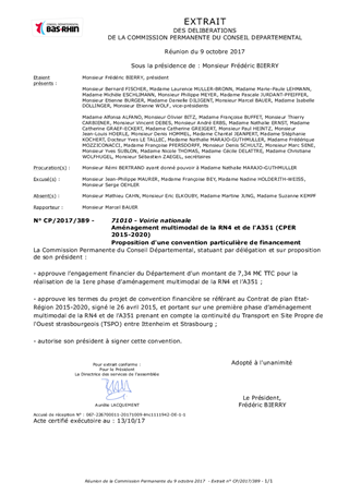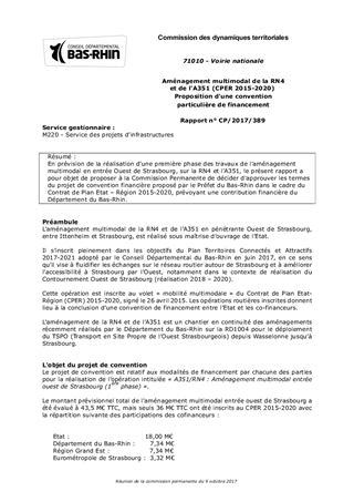 En prévision de la réalisation d’une première phase des travaux de l’aménagement multimodal en entrée Ouest de Strasbourg, sur la RN4 et l’A351, le présent rapport a pour objet de proposer à la Commission Permanente de décider d'approuver les termes du projet de convention financière proposé par le Préfet du Bas-Rhin dans le cadre du Contrat de Plan Etat – Région 2015-2020, prévoyant une contribution financière du Département du Bas-Rhin.