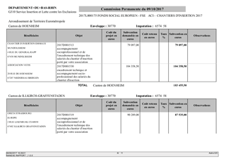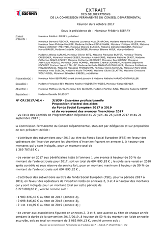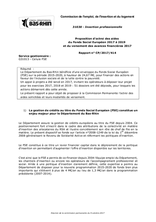 Le Département du Bas-Rhin bénéficie d’une enveloppe du Fonds Social Européen (FSE) sur la période 2015-2020, à hauteur de 24,67 M€, pour financer des actions en faveur de l’inclusion sociale et de la lutte contre la pauvreté. Un appel à projets a été lancé en 2017, invitant les opérateurs à déposer leur projet pour les exercices 2017, 2018 et 2019 : 51 dossiers ont été déposés, pour lesquels les actions démarrent dès cette année. Le présent rapport a pour objet de proposer à la Commission Permanente l’octroi des aides sollicitées et leurs modalités de versement.
