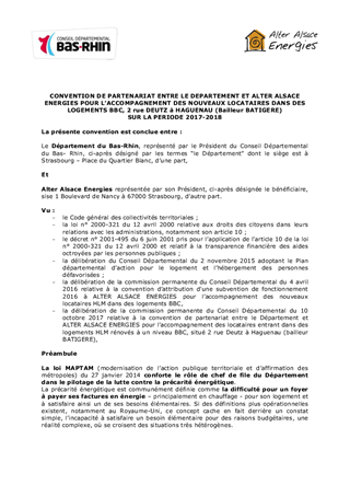 Le présent rapport a pour objet de proposer à la Commission Permanente de décider d'attribuer une subvention à l'association Alter Alsace Energies et d'approuver les termes du projet de convention de partenariat à conclure avec le Département, pour l'accompagnement de locataires qui rentrent dans un logement de niveau BBC, 2 rue Deutz à Haguenau (bailleur BATIGERE) et ce, dans le cadre des actions de lutte contre la précarité énergétique inscrites au Plan Départemental d'Action pour le Logement et l'Hébergement des Personnes Défavorisées (PDALHPD) 2015-2020. Il s'agit d'accompagner, en lien avec les services sociaux polyvalents de secteur, des groupes de locataires sur une année via des animations collectives et des accompagnements individualisés (lecture des factures, usage des équipements des logements, etc.) afin de leur permettre d'appréhender de nouveaux modes de vie et de nouveaux réflexes.