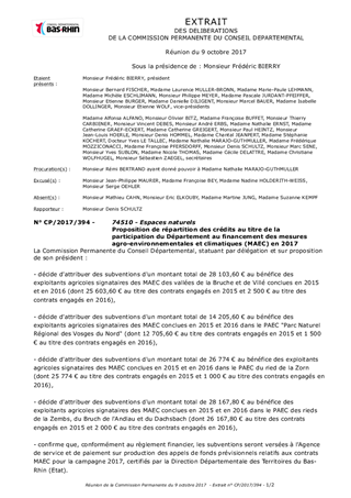 Des mesures agro-environnementales et climatiques (MAEC) portées ou soutenues financièrement par le Département du Bas-Rhin ont été souscrites par les exploitants agricoles en 2015 et en 2016 pour une période de 5 ans. Les principes et les conditions financières de l’intervention du Département du Bas-Rhin dans les MAEC ont été validés lors de la réunion du Conseil Départemental du 6 juillet 2015 (délibération n° CD/2015/86). Le présent rapport a pour objet de proposer à la Commission Permanente de décider de l'attribution de subventions pour la mise en œuvre de ces actions au titre de l’année 2017.