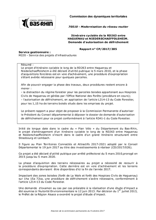 Le projet d'itinéraire cyclable le long de la RD263 entre Haguenau et Niederschaeffolsheim a été déclaré d'utilité publique le 5 mars 2010, et la phase d'acquisitions foncières est en voie d'achèvement, une procédure d'expropriation s'étant avérée nécessaire pour quelques parcelles. Afin de pouvoir engager la phase des travaux, deux procédures restent encore à mener : - la distraction du régime forestier pour les parcelles boisées appartenant aux Hospices Civils de Haguenau et gérées par l'Office National des Forêts (procédure en cours); - l'autorisation de défrichement, en application de l'article L214-13 du Code Forestier, pour les 1,15 ha de terrains boisés situés dans les emprises du projet. Le présent rapport a pour objet de proposer à la Commission Permanente d'autoriser le Président du Conseil départemental à déposer le dossier de demande d'autorisation de défrichement pour ce projet conformément à l'article R341-1 du Code Forestier.