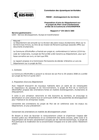 Le Département est consulté sur la révision des plans locaux d’urbanisme (PLU) sur le territoire bas-rhinois, au titre de sa mission de Personne publique associée (PPA) aux documents d’urbanisme. La Commune d’Eichhoffen a finalisé son projet et, conformément à l'article L123-9 du code de l’urbanisme, le projet de PLU arrêté a été transmis au Département, pour qu’il fasse connaître son avis, en tant que PPA. Le rapport propose à la Commission Permanente de décider d’émettre un avis du Département sur le projet de PLU.