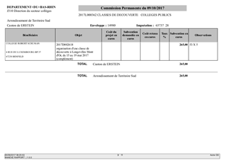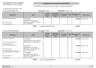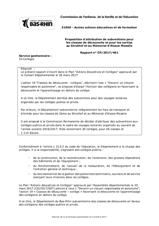 Le présent rapport s'inscrit dans le Plan "Actions éducatives et Collèges" approuvé par le Conseil Départemental le 20 mars 2017. L'action 19 "Classes de découverte - collèges", déclinant l'axe 1 "Devenir un citoyen responsable et autonome", se propose d'élargir l'horizon des collégiens en favorisant la découverte et l'apprentissage en dehors du collège. A ce titre, le Département attribue des subventions pour des voyages scolaires organisés par les collèges publics et privés. Par ailleurs, le Département subventionne intégralement les frais de transport et d'entrée pour les classes de 3ème au Struthof et au Mémorial d'Alsace Moselle. Il est proposé à la Commission Permanente de décider d'attribuer des subventions aux collèges publics et privés dans le cadre de voyages scolaires organisés au courant de l'année scolaire 2016/2017. Elles concernent 20 collèges, pour 46 classes et 1 114 élèves.