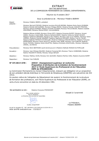 Le présent rapport propose à la Commission Permanente, au titre de l'exercice 2017, et en vertu d'une obligation conventionnelle en date de 1991, de décider d'attribuer la contribution départementale au fonctionnement de l'Institut Universitaire de Formation des Maîtres (IUFM), devenu en 2013 l'Ecole Supérieure du Professorat et de l'Education (ESPE) et rattaché à l'UNISTRA.