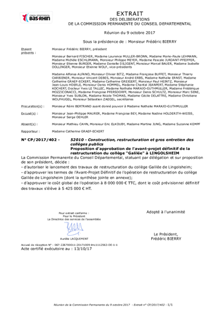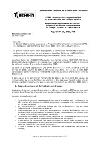 Le Conseil Départemental a approuvé le Programme Pluriannuel d’Investissement (PPI) des collèges en séance Plénière du 20 mars 2017 (délibération CD/2017/012). Le présent rapport a pour objet de proposer à la Commission Permanente de décider du lancement des travaux de restructuration du collège Galilée de LINGOLSHEIM et d’approuver les termes de l’Avant-Projet Définitif (APD) de ces travaux.