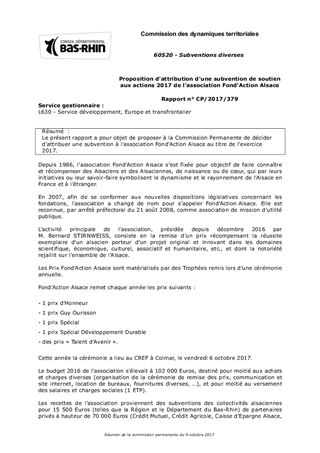 Le présent rapport a pour objet de proposer à la Commission Permanente de décider d'attribuer une subvention à l'association Fond'Action Alsace au titre de l'exercice 2017.