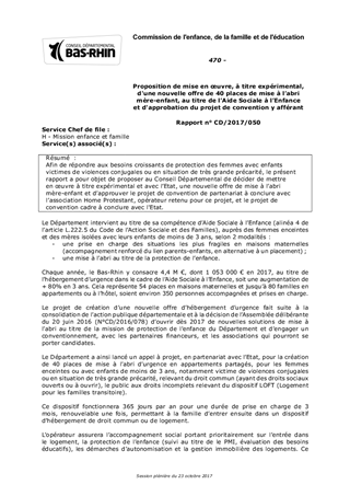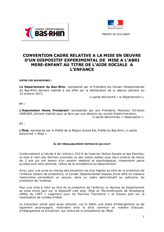 Afin de répondre aux besoins croissants de protection des femmes avec enfants victimes de violences conjugales ou en situation de très grande précarité, le présent rapport a pour objet de proposer au Conseil Départemental de décider de mettre en œuvre à titre expérimental et avec l’Etat, une nouvelle offre de mise à l’abri mère-enfant et d’approuver le projet de convention de partenariat à conclure avec l’association Home Protestant, opérateur retenu pour ce projet, et le projet de convention cadre à conclure avec l'Etat.