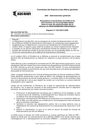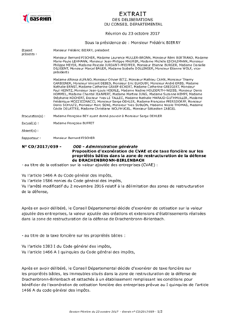 Le Département du Bas-Rhin est co-signataire du Contrat de Redynamisation du Site de la Défense (CRSD) de Drachenbronn-Birlenbach. En complément des engagements budgétaires que le Département a souscrits par délibération N° CP/2016/445 du 3 octobre 2016, le rapport a pour objet de proposer au Conseil Départemental d'adopter à compter du 1er janvier 2019 deux exonérations fiscales de cotisation sur la valeur ajoutée des entreprises (CVAE) et de taxe foncière sur les propriétés bâties au titre de la zone de restructuration de la défense de Drachenbronn-Birlenbach.