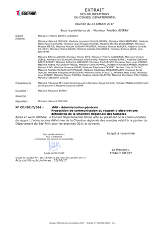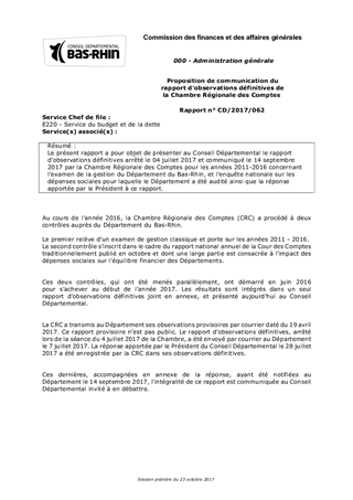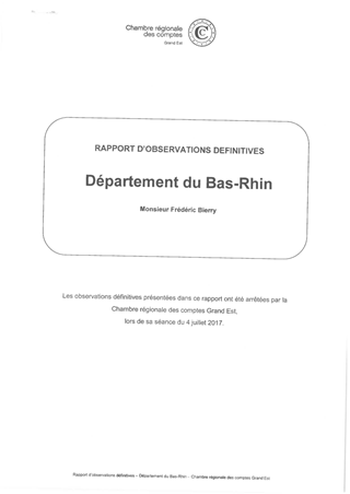 Le présent rapport a pour objet de présenter au Conseil Départemental le rapport d'observations définitives arrêté le 04 juillet 2017 et communiqué le 14 septembre 2017 par la Chambre Régionale des Comptes pour les années 2011-2016 concernant l'examen de la gestion du Département du Bas-Rhin, et l'enquête nationale sur les dépenses sociales pour laquelle le Département a été audité ainsi que la réponse apportée par le Président à ce rapport.