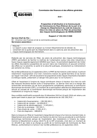 Le rapport a pour objet de proposer au Conseil Départemental de décider du versement de la quote-part du Département dans le cadre du plan de prévention des risques technologiques de Herrlisheim.