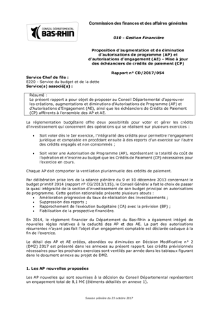 Le présent rapport a pour objet de proposer au Conseil Départemental d'approuver les créations, augmentations et diminutions d'Autorisations de Programme (AP) et d'Autorisations d'Engagement (AE), ainsi que les échéanciers de Crédits de Paiement (CP) afférents à l'ensemble des AP et AE.