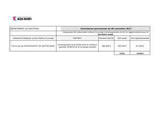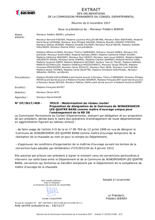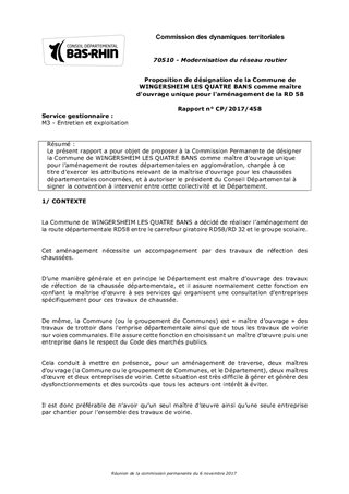 Le présent rapport a pour objet de proposer à la Commission Permanente de désigner la Commune de WINGERSHEIM LES QUATRE BANS comme maître d’ouvrage unique pour l’aménagement de routes départementales en agglomération, chargée à ce titre d’exercer les attributions relevant de la maîtrise d’ouvrage pour les chaussées départementales concernées, et à autoriser le président du Conseil Départemental à signer la convention à intervenir entre cette collectivité et le Département.
