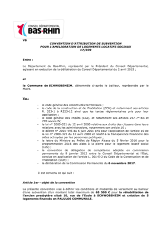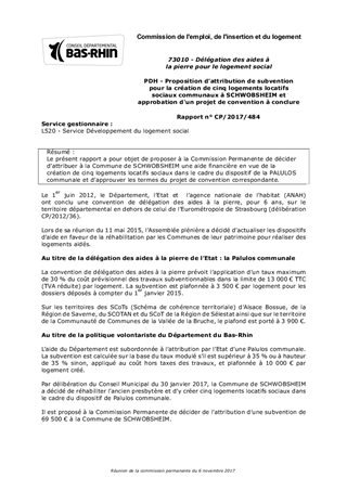 Le présent rapport a pour objet de proposer à la Commission Permanente de décider d’attribuer à la Commune de SCHWOBSHEIM une aide financière en vue de la création de cinq logements locatifs sociaux dans le cadre du dispositif de la PALULOS communale et d’approuver les termes du projet de convention correspondante.