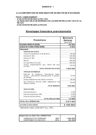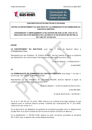 La Communauté de Communes du Canton d'Erstein souhaite améliorer la desserte du Parc d'Activités des Nations et l'accessibilité des entreprises dans Benfeld. Le Département et la Communauté de Communes du Canton d'Erstein projettent de réaliser un projet de liaison entre la RD1083 et la RD829, comprenant deux opérations - la réalisation d'un giratoire sur la RD1083 et d'une piste cyclable longeant la liaison avec un passage inférieur sous la RD1083, sous maîtrise d'ouvrage communautaire; - la réalisation d'un barreau routier avec un giratoire de raccordement sur la RD829, sous maîtrise d'ouvrage départementale. Ces aménagements étant indissociables les uns des autres, il est proposé de désigner le Département comme maître d'ouvrage unique du projet global. Il est proposé qu'une convention soit conclue à cet effet, pour définir les modalités techniques et financières de cette co-maîtrise d'ouvrage. Par ailleurs, certains ouvrages et équipements communautaires étant situés sur le domaine public routier départemental, il est proposé qu'une autre convention précise les modalités d'intervention de chaque collectivité en matière de gestion et d'entretien ultérieurs des différents ouvrages réalisés. Le présent rapport a donc pour objet de proposer à la Commission Permanente : - de décider que le Département assurera la maîtrise d'ouvrage de l'ensemble du projet d'aménagement de la liaison RD1083-RD829 à Benfeld-Sand; - d'approuver les termes du projet de convention à conclure entre la Communauté de Communes et le Département actant la désignation de ce dernier comme maître d'ouvrage unique du projet et la participation de la Communauté de Communes à 80% du coût de l'opération; - d'approuver les termes du projet de convention de co-maîtrise d'ouvrage et du projet de convention de gestion ultérieure des ouvrages et aménagements réalisés, à conclure entre la Communauté de Communes et le Département du Bas-Rhin.