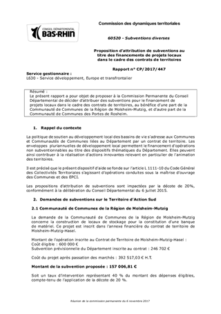 Le présent rapport a pour objet de proposer à la Commission Permanente du Conseil Départemental de décider d'attribuer des subventions pour le financement de projets locaux dans le cadre des contrats de territoires, au bénéfice d'une part de la Communauté de Communes de la Région de Molsheim-Mutzig, et d'autre part de la Communauté de Communes des Portes de Rosheim.