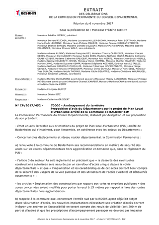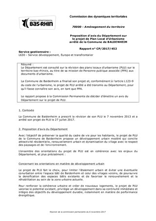 Le Département est consulté sur la révision des plans locaux d’urbanisme (PLU) sur le territoire bas-rhinois, au titre de sa mission de Personne publique associée (PPA) aux documents d’urbanisme. La Commune de Baldenheim a finalisé son projet et, conformément à l'article L123-9 du code de l’urbanisme, le projet de PLU arrêté a été transmis au Département, pour qu’il fasse connaître son avis, en tant que PPA. Le rapport propose à la Commission Permanente de décider d’émettre un avis du Département sur le projet de PLU.