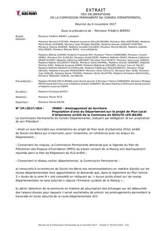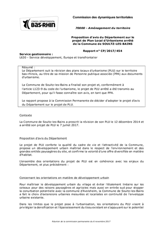 Le Département suit la révision des plans locaux d’urbanisme (PLU) sur le territoire bas-rhinois, au titre de sa mission de Personne publique associée (PPA) aux documents d’urbanisme. La Commune de Soultz-les-Bains a finalisé son projet et, conformément à l'article L123-9 du code de l’urbanisme, le projet de PLU arrêté a été transmis au Département, pour qu’il fasse connaître son avis, en tant que PPA. Le rapport propose à la Commission Permanente de décider d’adopter le projet d’avis du Département sur le projet de PLU.