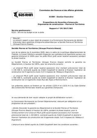 Le présent rapport a pour objet de proposer à la Commission Permanente de décider d’accorder deux garanties d’emprunts présentées par la Société Pierres et Territoires (Groupe Procivis Alsace).