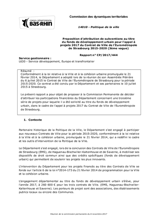 Conformément à la loi relative à la Ville et à la cohésion urbaine promulguée le 21 février 2014, le Département a adopté lors de la réunion de son Assemblée Plénière du 6 juillet 2015 le Contrat de Ville de l’Eurométropole de Strasbourg pour la période 2015-2020. Ce contrat a été conclu par le Département et ses partenaires le 10 juillet 2015 à Strasbourg. Le présent rapport a pour objet de proposer à la Commission Permanente de décider d’attribuer les participations financières du Département concernant une troisième série de projets pour laquelle il a été sollicité au titre du fonds de développement urbain, dans le cadre de l’appel à projets 2017 du Contrat de Ville de l’Eurométropole de Strasbourg.