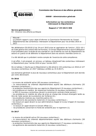Le présent rapport a pour objet d'informer la Commission Permanente du Conseil Départemental des contentieux intéressant le Département pour les années 2016 et 2017
